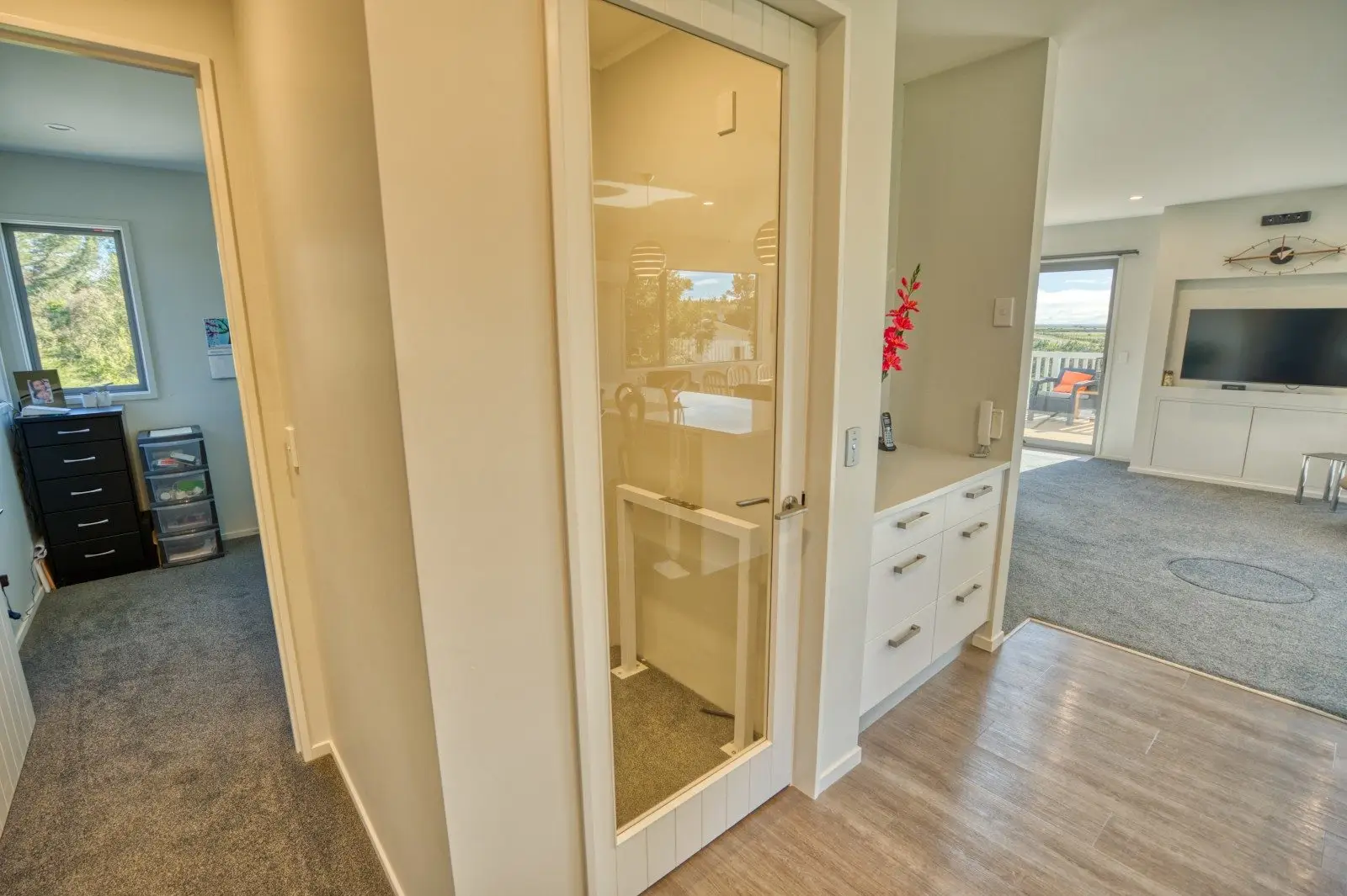 Set against a backdrop of sweeping sea and mountain views, the two-storey 250m² home perfectly balances comfort, versatility, and lifestyle. Upstairs, the spacious master suite boasts a walk-in robe and luxurious ensuite with spa bath, alongside an additional single bedroom or office. The open-plan living zone features a modern kitchen with walk-in pantry and seamless flow to dining and lounge areas, while sliding doors extend to a large balcony capturing breath-taking views across the Kakapotahi Valley and surrounding farmland. A lift connects both levels for ease of access.